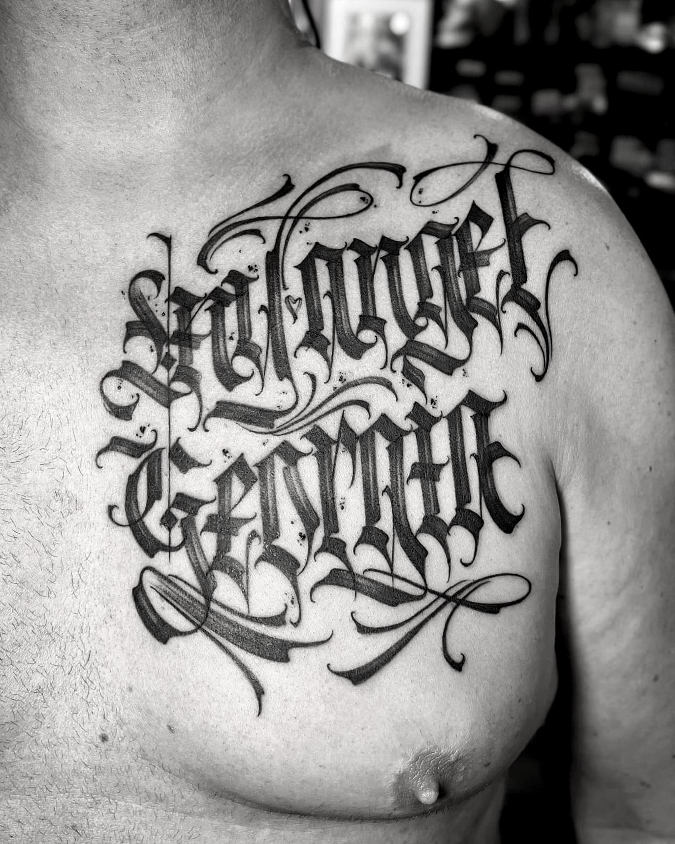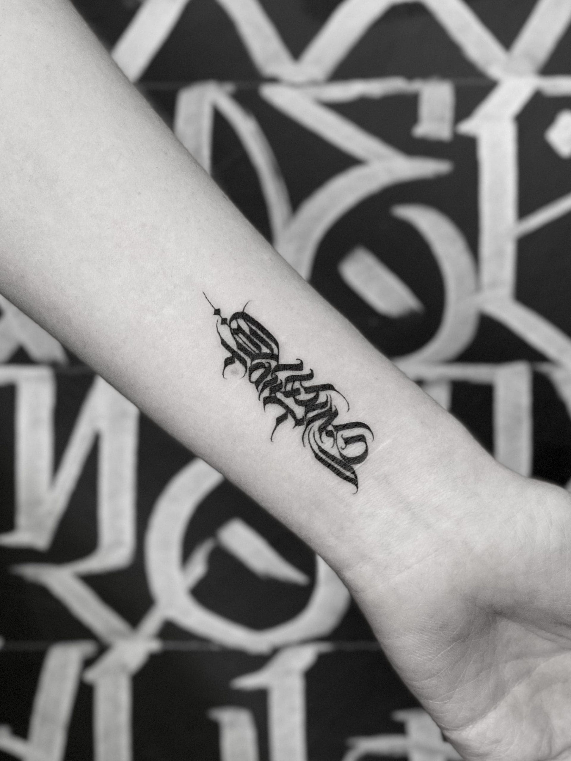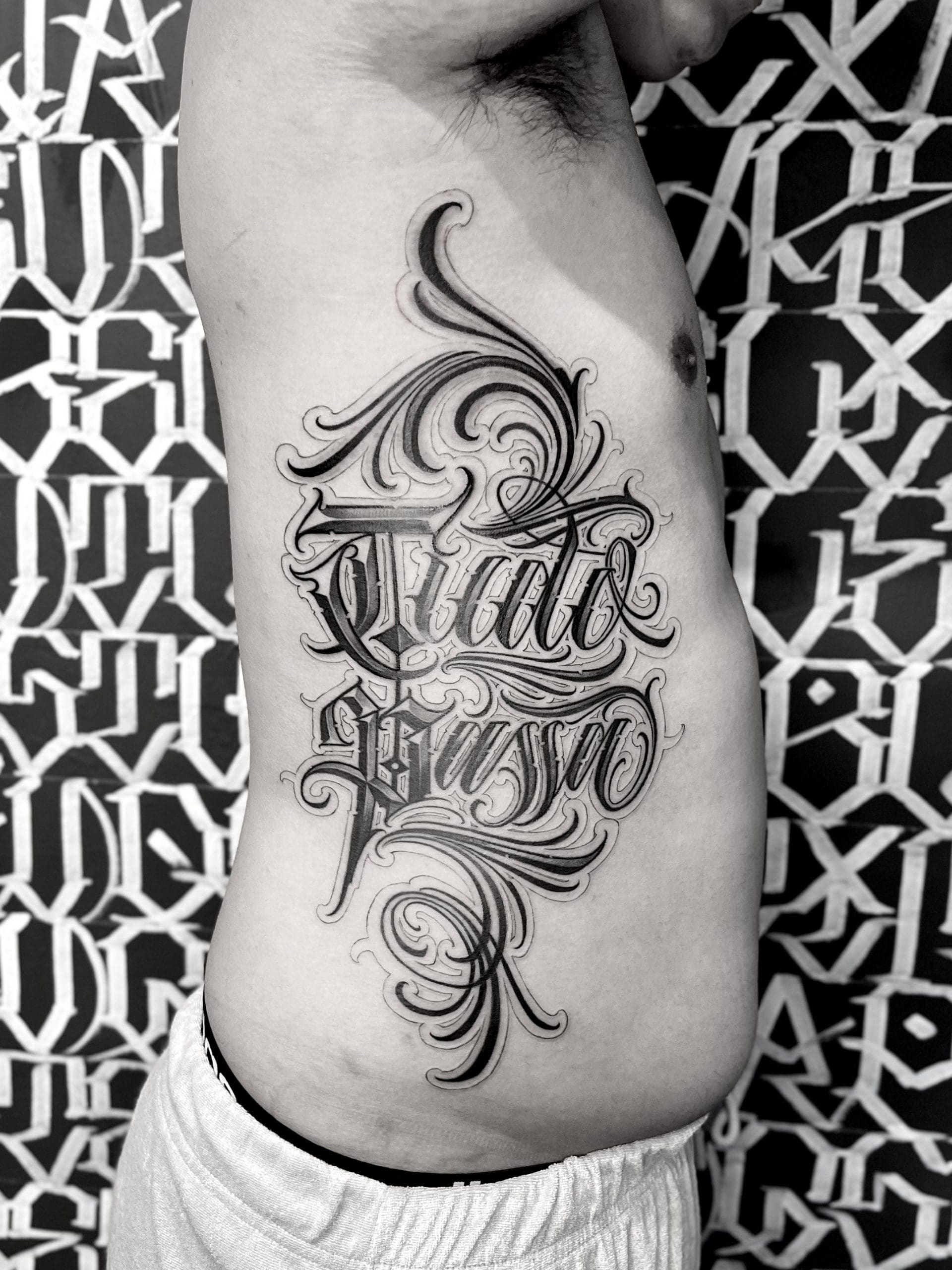 Maßgeschneiderte (Custom) Kalligrafie-Tattoos heben Schrift auf ein neues Level: kraftvoll, komplex und absolut einzigartig. Hier geht es nicht nur um einfache Schriftarten auf der Haut, sondern um freihändig entworfene Kompositionen, direkt vom Künstler gezeichnet, um deine Geschichte, deine Botschaft und deinen Stil perfekt widerzuspiegeln. Im Gegensatz zu klassischen Script-Tattoos werden diese, oft großformatigen, Arbeiten von Grund auf für dich designed – jeder Buchstabe wird Freihand, präzise und mit künstlerischer Freiheit gestaltet, abgestimmt auf die Anatomie des Körpers.