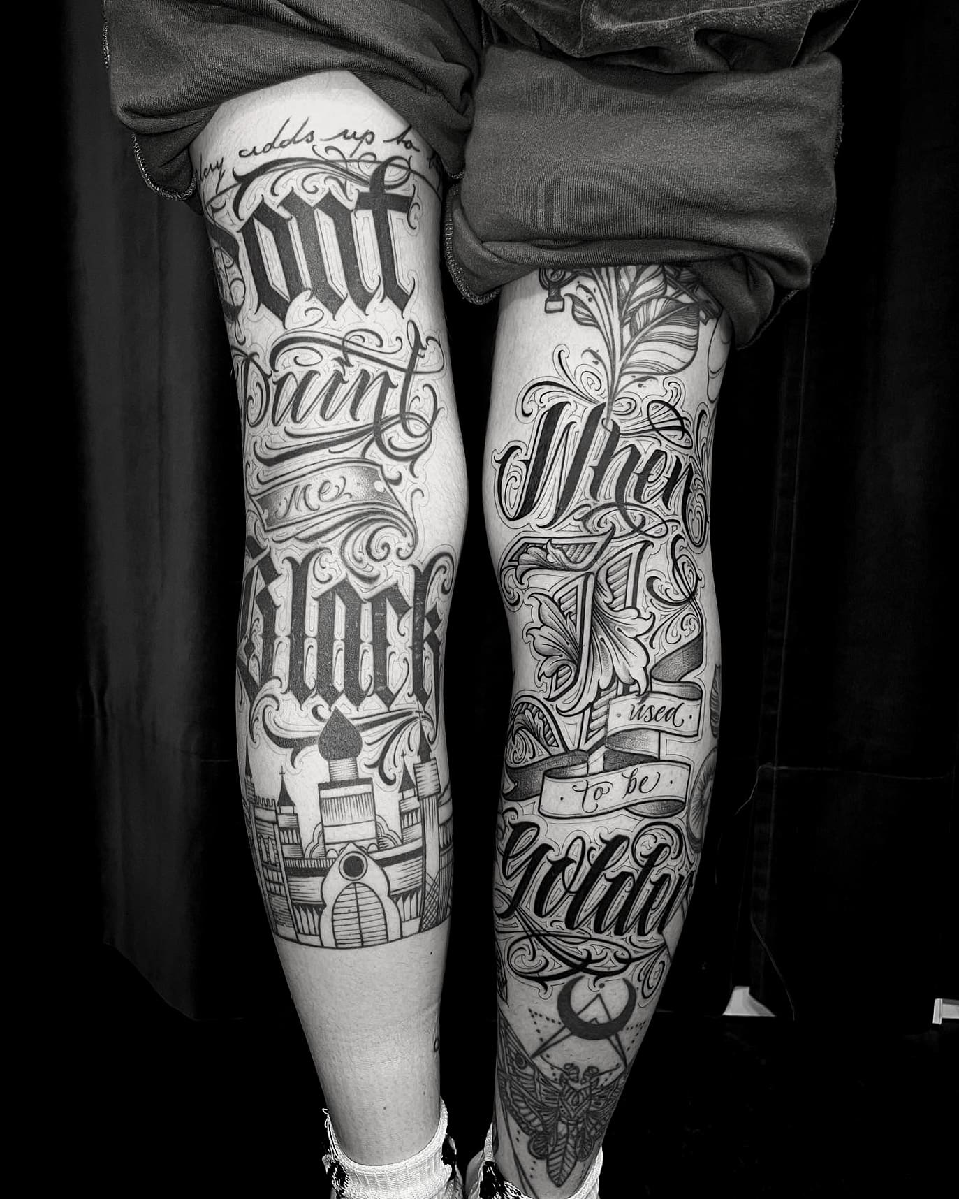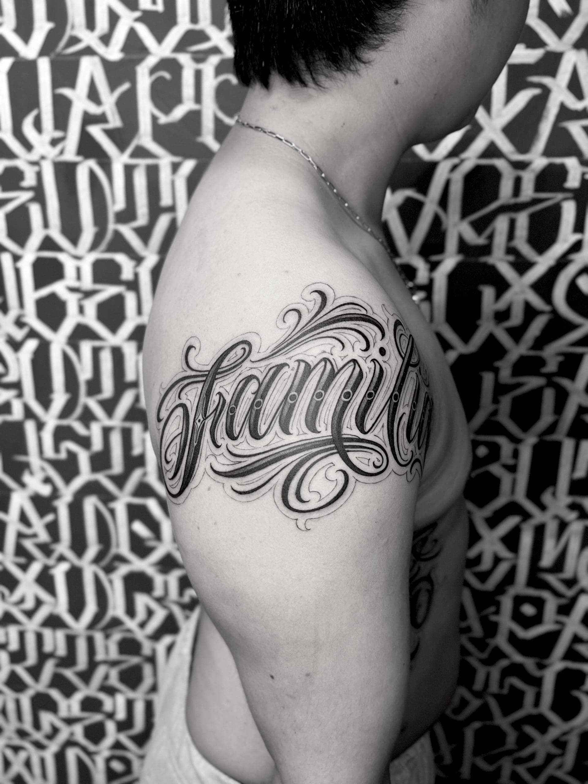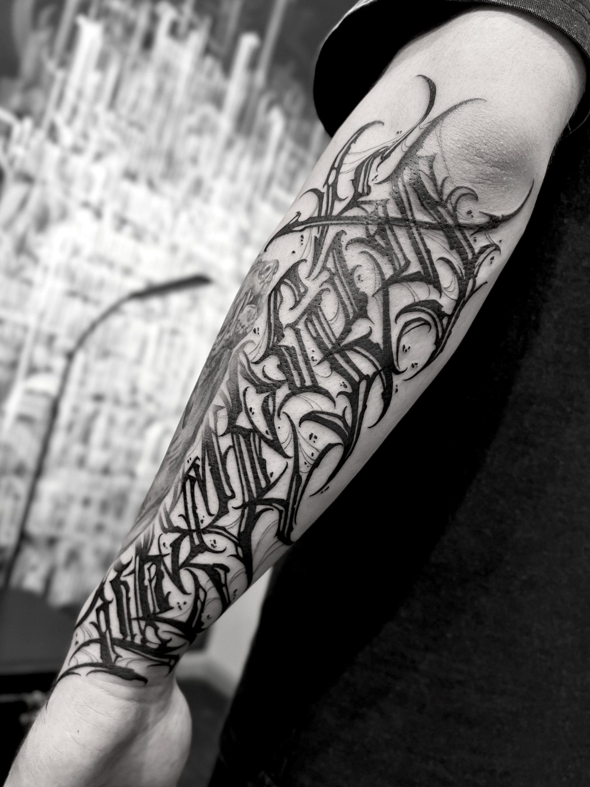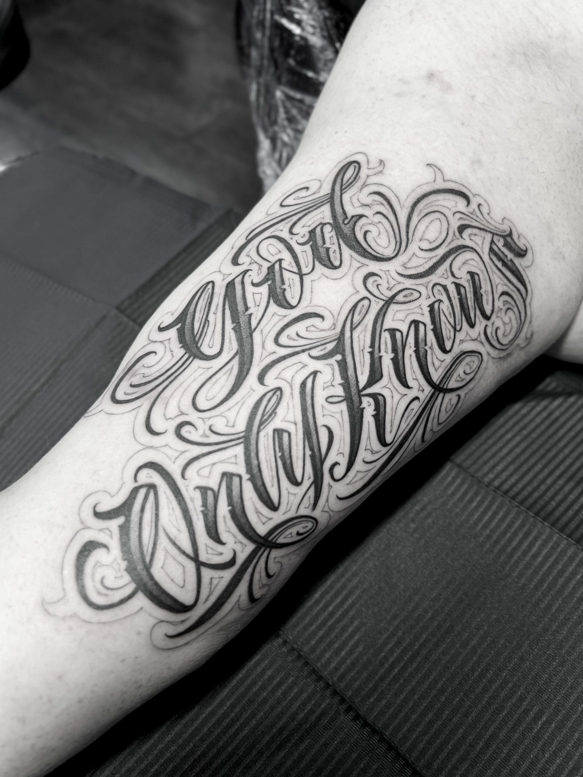 Maßgeschneiderte (Custom) Kalligrafie-Tattoos heben Schrift auf ein neues Level: kraftvoll, komplex und absolut einzigartig. Hier geht es nicht nur um einfache Schriftarten auf der Haut, sondern um freihändig entworfene Kompositionen, direkt vom Künstler gezeichnet, um deine Geschichte, deine Botschaft und deinen Stil perfekt widerzuspiegeln. Im Gegensatz zu klassischen Script-Tattoos werden diese, oft großformatigen, Arbeiten von Grund auf für dich designed – jeder Buchstabe wird Freihand, präzise und mit künstlerischer Freiheit gestaltet, abgestimmt auf die Anatomie des Körpers.