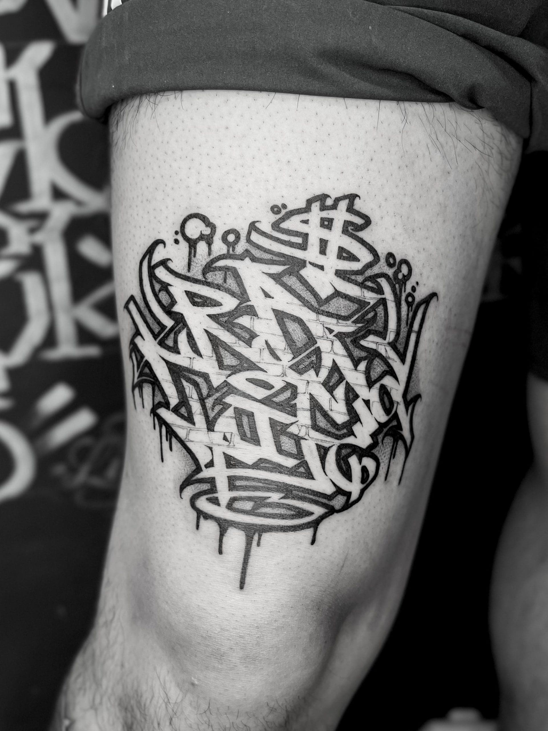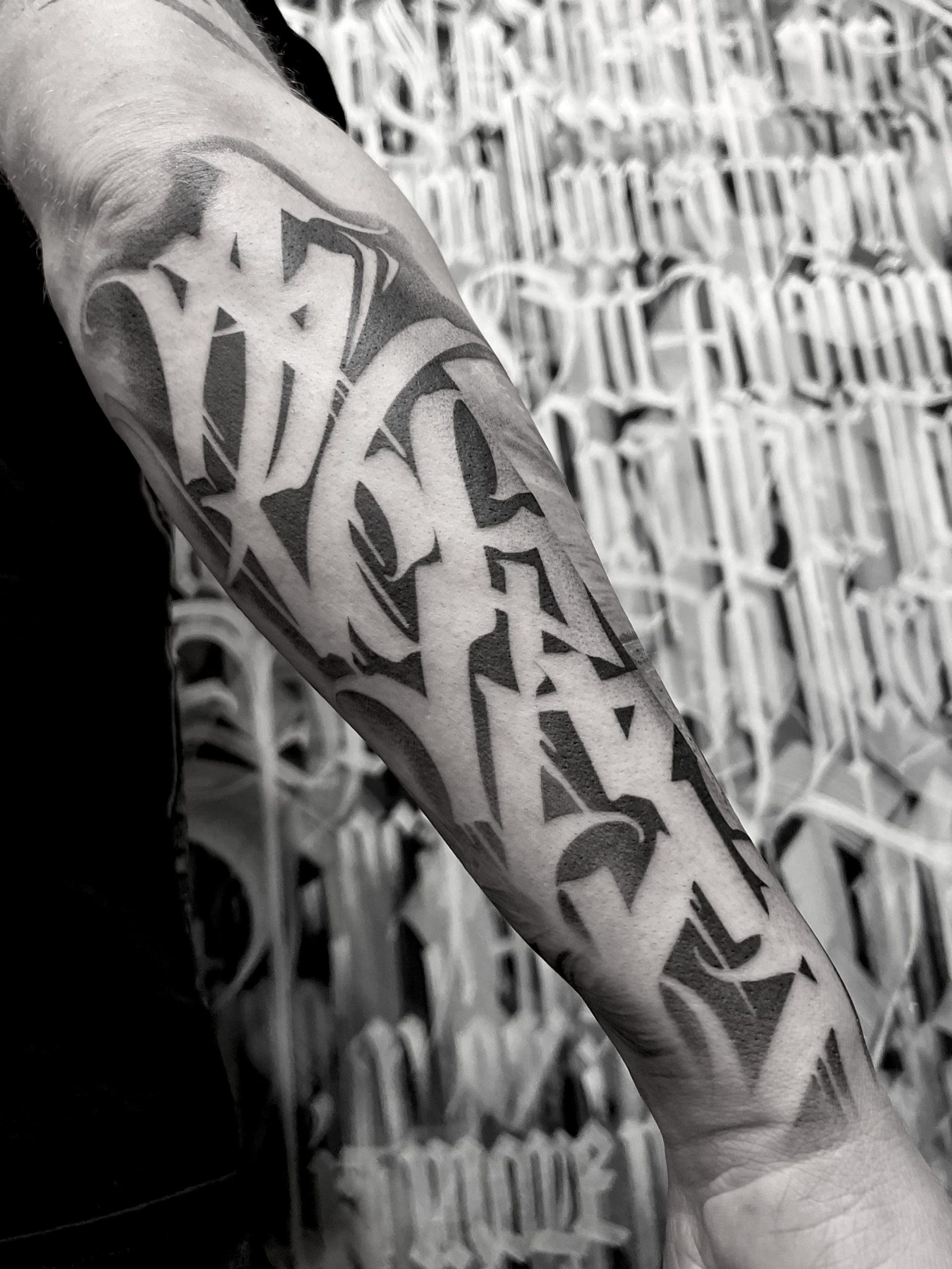 Dieser Stil schöpft aus einer Vielzahl visueller Einflüsse: von klassischer Kalligrafie und kunstvollen Ornamenten über Graffiti, Sprüheffekten und sogar steinähnlich gravierten Texturen bis hin zu Knochenstrukturen und rauen, geritzten Ästhetiken, um nur einige zu nennen. Ob du etwas Sauberes und Elegantes suchst oder Rohes und Abstraktes – Custom Calligraphy ist eine kraftvolle Möglichkeit, Worte in visuelle Unikate zu verwandeln. Unsere spezialisierten Artists freuen sich darauf, von deiner Vision zu hören und sie Wirklichkeit werden zu lassen.